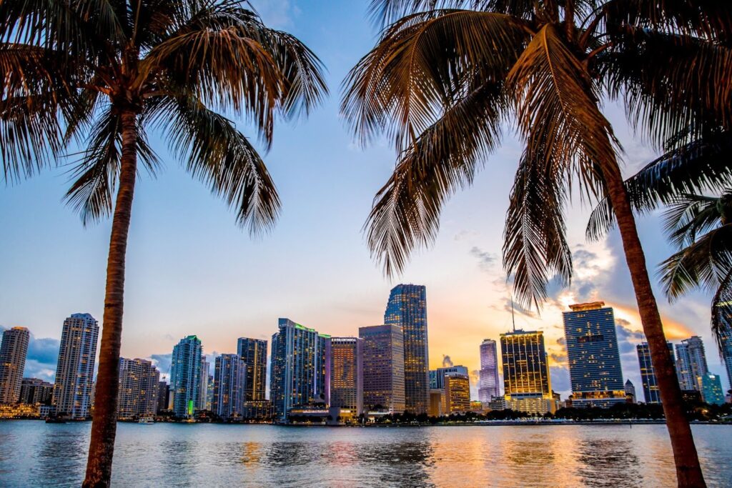 Miami é conhecida por suas praias, clima tropical e influência latina. Miami Beach, especialmente South Beach, é famosa pelo estilo art déco, vida noturna e águas claras.